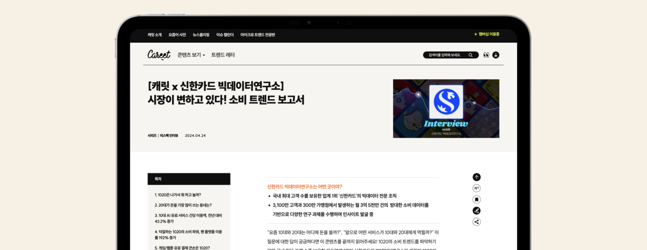「캐릿(Careet)」과 신한카드 빅데이터연구소와 협업한 소비 트렌드 보고서. 캐릿은 기존에 독자들에게 주지 못했던 정보를 줄 수 있다면 적극적으로 협업에 나선다. ⓒ대학내일ES