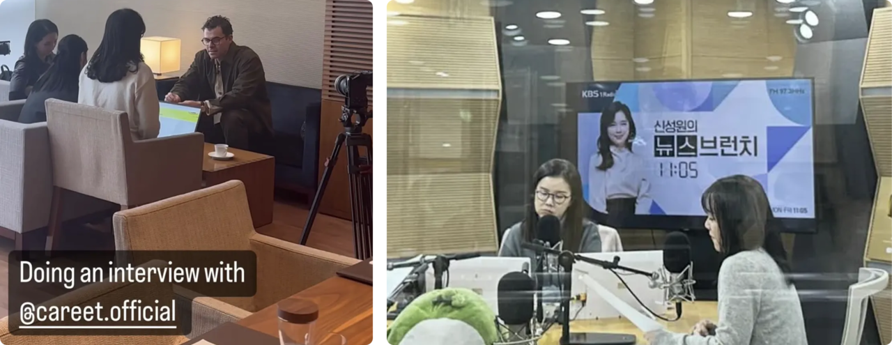 (좌) 인스타그램 CEO '아담 모세리'와 진행한 인터뷰하는 모습/ (우) KBS 라디오 '뉴스브런치'에서 트렌드를 설명하는 모습 ⓒ대학내일ES