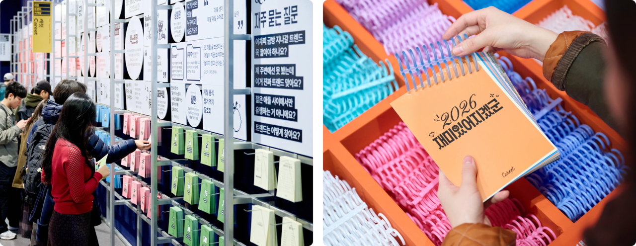 최근에는 온라인을 넘어 오프라인에서 독자와 만나는 시도도 이어지고 있습니다. 울트라백화점 전시는 캐릿이 처음으로 오프라인 공간에서 트렌드를 풀어낸 사례였어요. 온라인 아티클로 다뤄왔던 트렌드와 인사이트를 북 바인딩 형태로 재구성해, 실제로 보고 넘길 수 있는 콘텐츠로 선보였습니다. 인스타그램 리오픈 이후 쌓아온 스낵형 트렌드 표현 방식을 전시 구성에도 활용하며, 캐릿다운 감각이 오프라인에서도 유효한지를 실험한 자리이기도 했습니다.