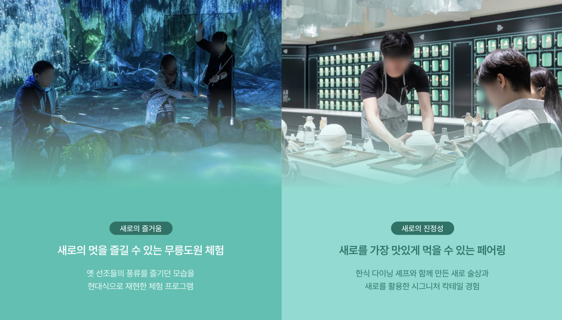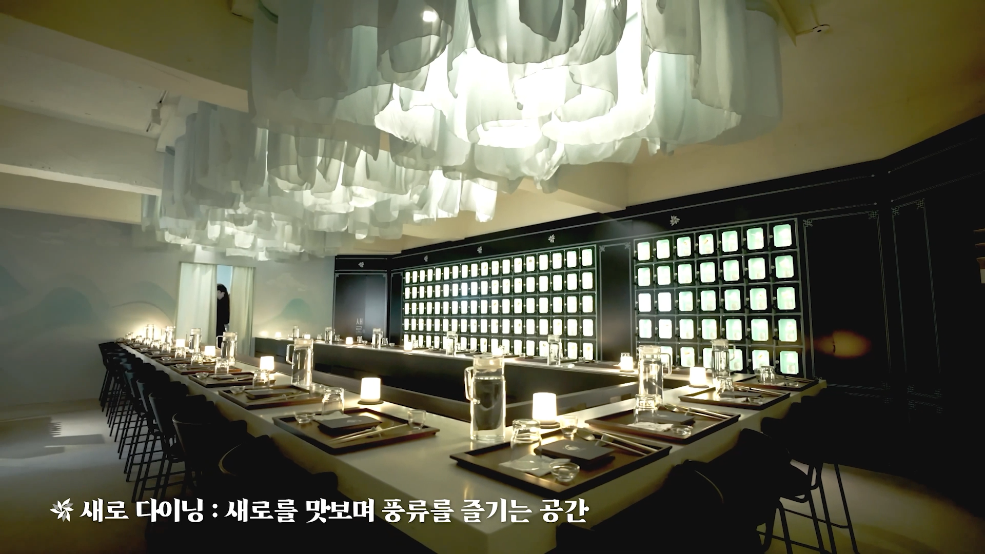 오오비컴퍼니는 옛 선조들의 풍류에서 영감을 받은 ‘무릉도원’을 컨셉으로, 팝업과 다이닝이 결합된 플래그십 스토어를 구현했습니다. 팝업 공간에서는 인터랙티브 미디어아트와 운세 낚시 등 풍류적 체험을 제공했으며, 다이닝 공간에서는 포석정을 현대적으로 재해석해 물 위에 술잔을 띄워 즐기는 독창적인 경험을 설계했습니다. 여기에 흑백요리사 조서형 셰프의 한식 술상을 더해 다이닝의 완성도를 높였습니다.